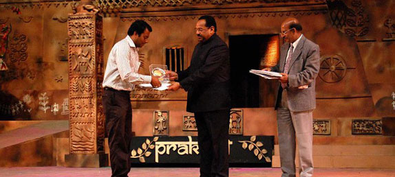 Debasis Patnaik receiving award from Kantilal Bhuriah, Minister of Tribal Affairs, Govt. of India, for the photograph titled “Art on the Wall” at New Delhi on 16th March 2011.